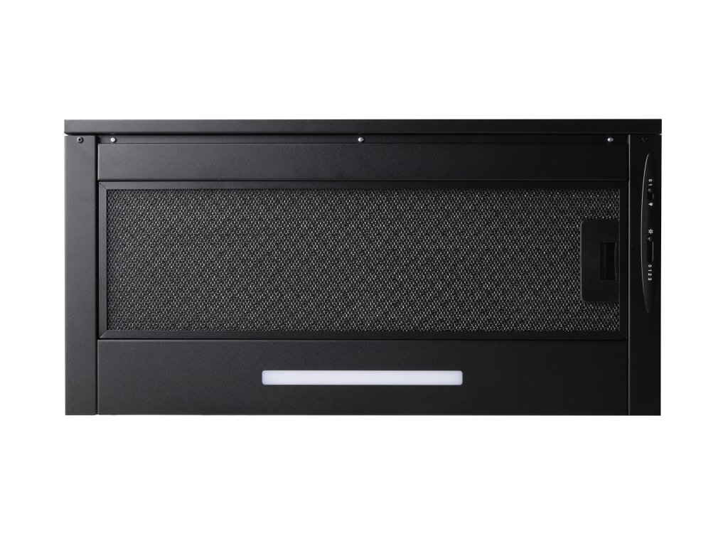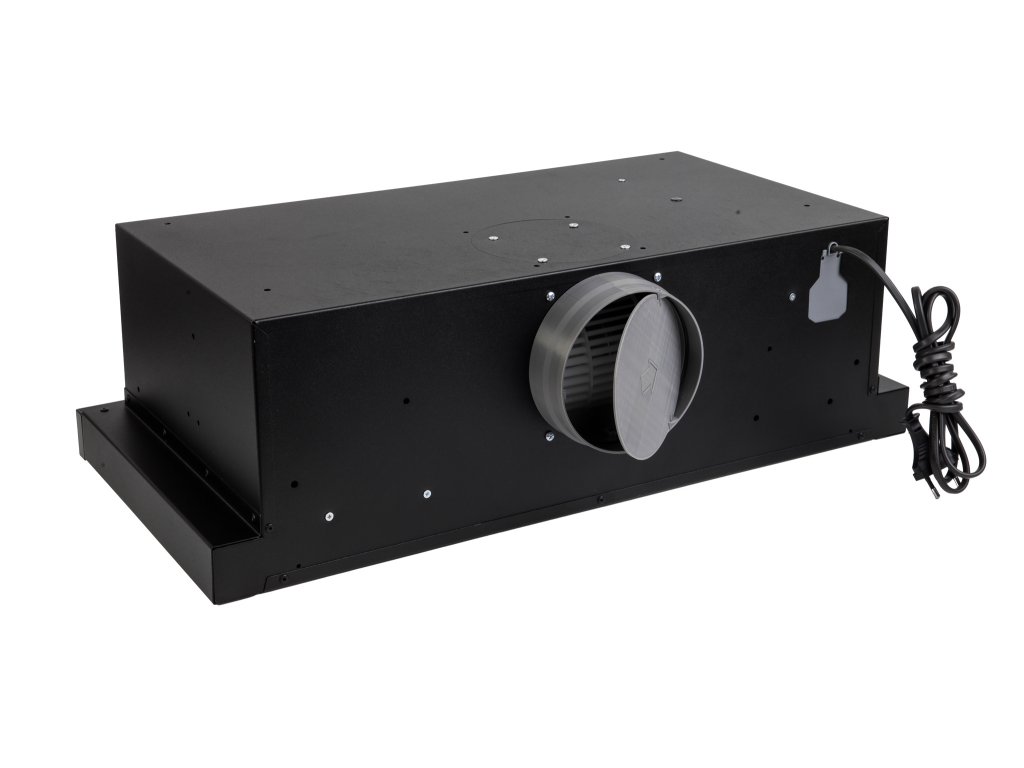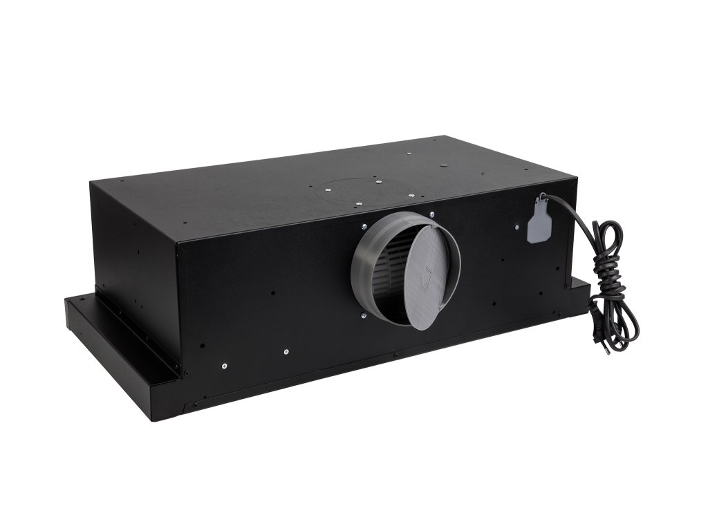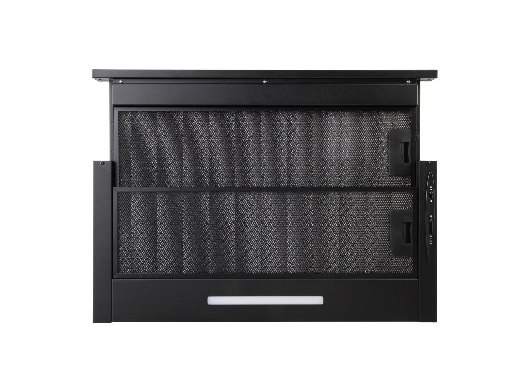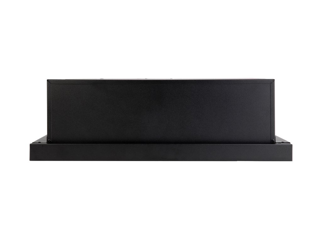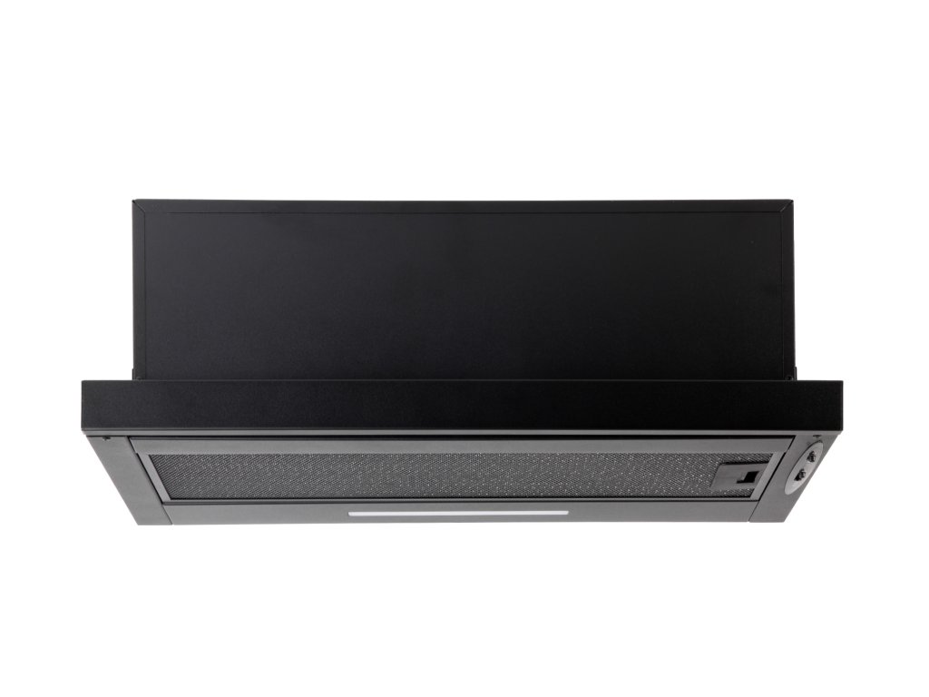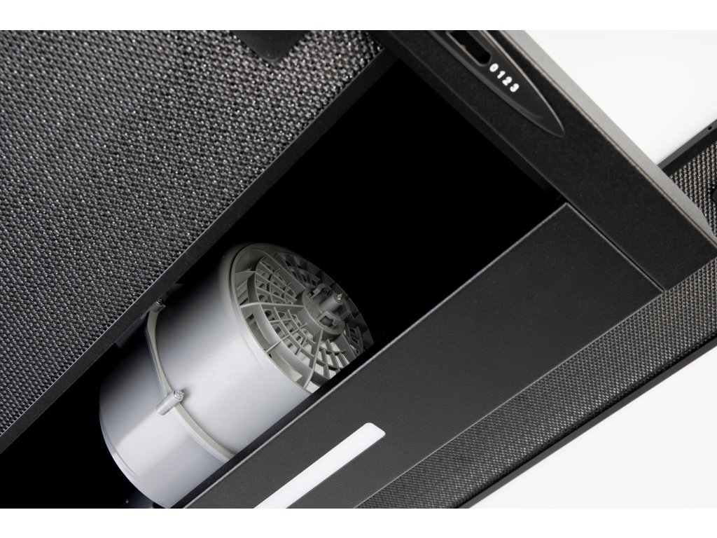 Vestavná digestoř výsuvná, jediná na trhu s odtahem dozadu nebo nahoru (oba 120 mm), šíře 60 cm, černá, max. výkon 338 m³/h (15 Pa), hlučnost Lw 56 – 71 dB(A), 3 rychlosti, odsávací jednotky mají individuálně vyvažovanou turbínu, motory jsou opatřené vratnými tepelnými pojistkami (při přetížení motoru vypne, po jeho vychladnutí opět sepne), mechanické posuvné ovládání, kovové sendvičové tukové filtry, které lze mýt v myčce, možnost práce v odtahovém i recirkulačním režimu, Výbava: úsporné LED osvětlení 1 × 2,8 W (LED pásek), zdarma zpětná klapka Recirkulační režim u vestavných digestoří: Digestoř se osadí uhlíkovým pachovým filtrem. Přefiltrovaný vzduch se z digestoře odvádí obdobně jako u odtahového režimu trubkou, která prochází celou skříňkou. Tato trubka však neústí kolenem do zdi, ale nad skříňku, kde ji doporučujeme zakončit mřížkou. Pro výrobu skříňky je směrodatný rozměrový nákres a údaje v něm uvedené. Fotografie digestoří jsou ilustrační.Doplňkové parametry