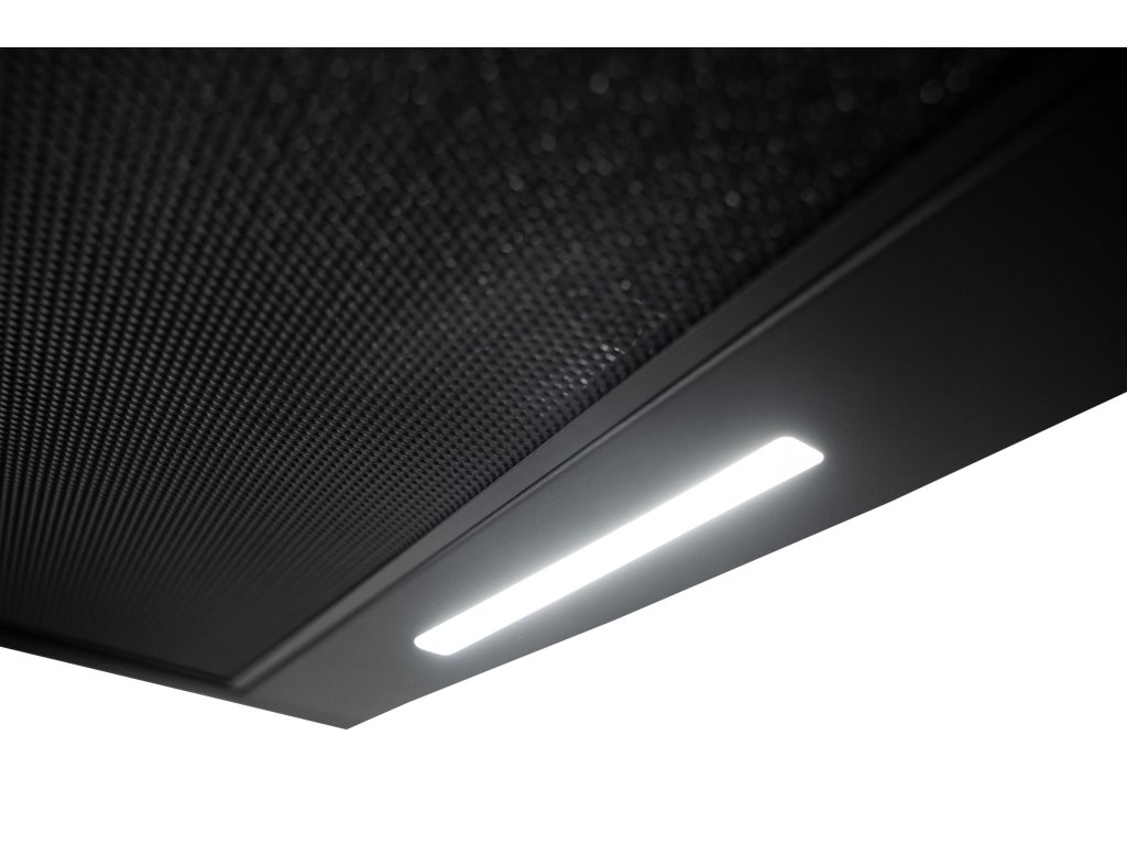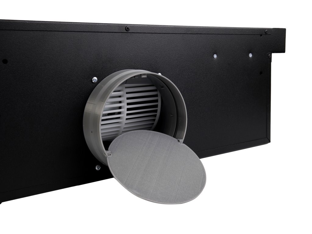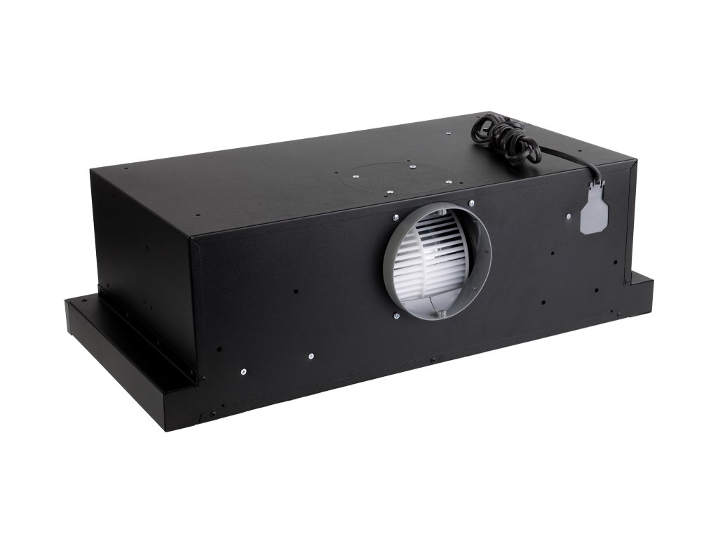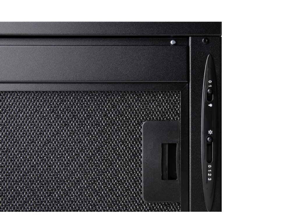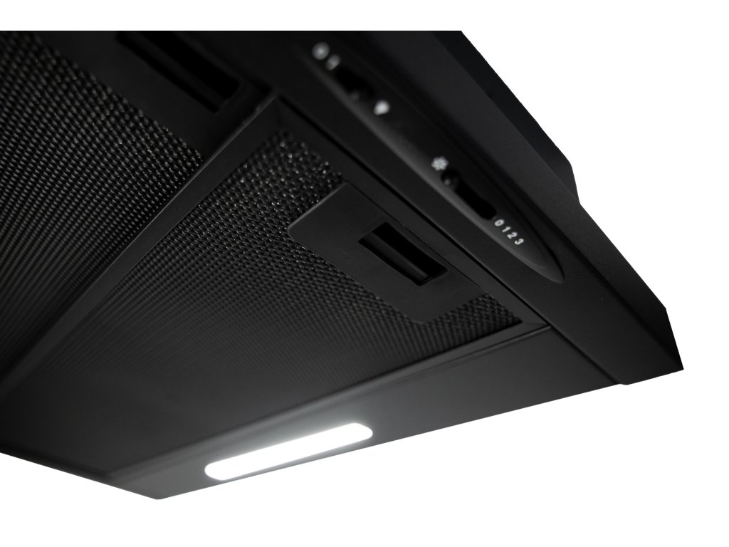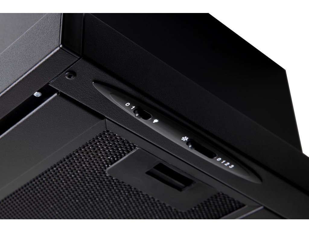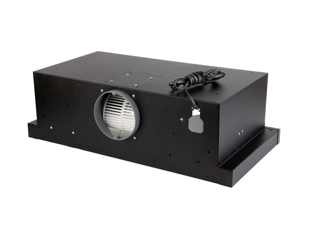 Vestavná digestoř výsuvná, jediná na trhu s odtahem dozadu nebo nahoru (oba 120 mm), šíře 60 cm, černá, max. výkon 338 m³/h (15 Pa), hlučnost Lw 56 – 71 dB(A), 3 rychlosti, odsávací jednotky mají individuálně vyvažovanou turbínu, motory jsou opatřené vratnými tepelnými pojistkami (při přetížení motoru vypne, po jeho vychladnutí opět sepne), mechanické posuvné ovládání, kovové sendvičové tukové filtry, které lze mýt v myčce, možnost práce v odtahovém i recirkulačním režimu, Výbava: úsporné LED osvětlení 1 × 2,8 W (LED pásek), zdarma zpětná klapka Recirkulační režim u vestavných digestoří: Digestoř se osadí uhlíkovým pachovým filtrem. Přefiltrovaný vzduch se z digestoře odvádí obdobně jako u odtahového režimu trubkou, která prochází celou skříňkou. Tato trubka však neústí kolenem do zdi, ale nad skříňku, kde ji doporučujeme zakončit mřížkou. Pro výrobu skříňky je směrodatný rozměrový nákres a údaje v něm uvedené. Fotografie digestoří jsou ilustrační.Doplňkové parametry