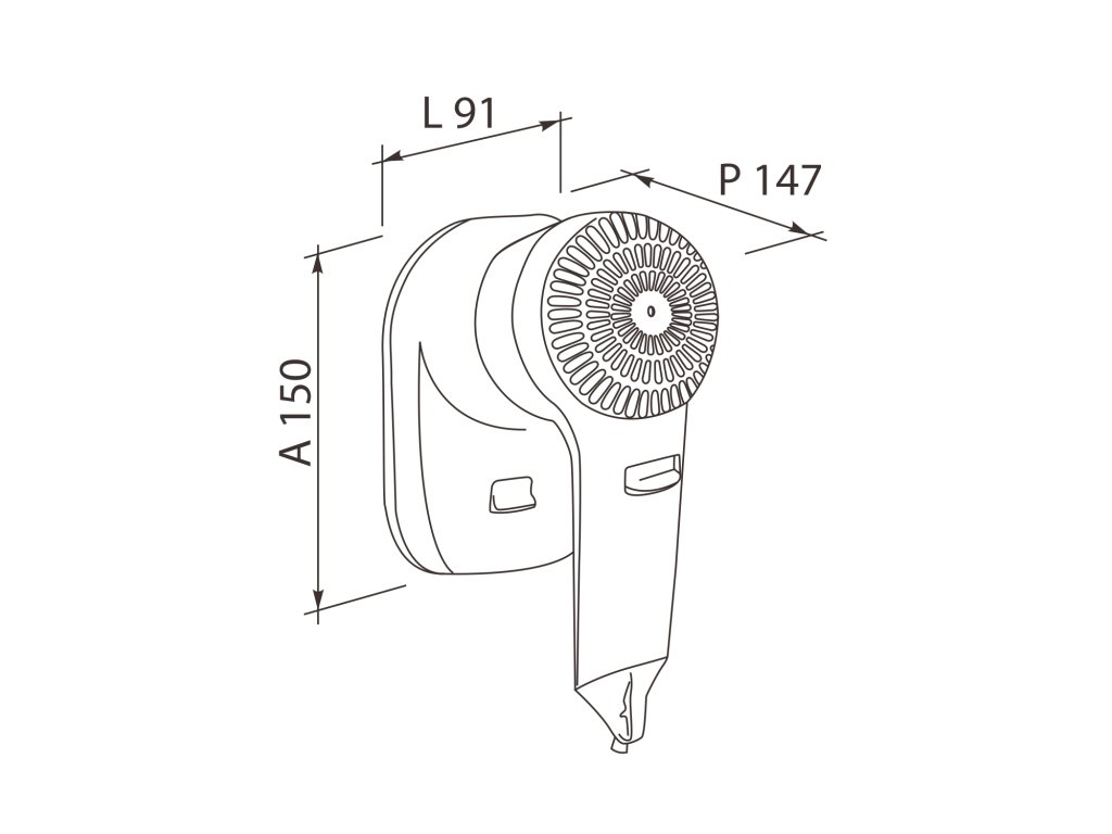 Hotelový fén s montáží na zeď, 2 rychlosti, 220 V - 240 V / 50 - 60 Hz, příkon 450 W (1. rychlost) / 1.200 W (2. rychlost), přepínač rychlostí a spouštěcí tlačítko na rukojeti, hlavní vypínač na stojánku, materiál ABS, bezpečnost CLASS II, dvojitá izolace, rozměry 150 mm výška × 100 mm šířka × 170 mm hloubka, hmotnost 0,65 kg