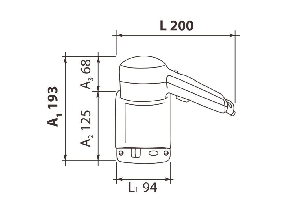 Hotelový fén s montáží na zeď, 2 rychlosti, 220 V - 240 V / 50 - 60 Hz, příkon 450 W (1. rychlost) / 1.200 W (2. rychlost), přepínač rychlostí a spouštěcí tlačítko na rukojeti, hlavní vypínač na stojánku, materiál ABS, bezpečnost CLASS II, dvojitá izolace, rozměry 180 mm výška × 150 mm šířka × 100 mm hloubka, hmotnost 0,65 kg