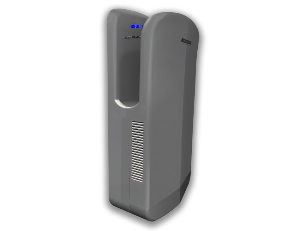 - Bezkontaktní a sterilní osušení rukou za 10-12 s - Topné těleso lze vypnout a tím více šetřit energii - Úspora až 80 % nákladů v porovnání s ručníky - 2x EPA E11 filtry a UV lampa pro hygienické osoušení - Automatické zapnutí při vložení rukou - Odnímatelný zásobník na vodu pro suchou podlahu pod osoušečem (POZOR na osoušeče, které nemají odkapávací misku – voda stékající na podlahu představuje nepořádek a zhoršenou hygienu) Osoušeč: 220-240 V / 50-60 Hz, příkon 1.450 W, IP31, CLASS II, CE - Motor: 1.100 W, 28.000 ot./min, s uhlíkovými kartáči - Ohřev vzduchu: 350 W, lze vypnout - Průtok vzduchu: 187 m3/h, resp. 52 l/s - Rychlost proudění vzduchu: 410 km/h (u ústí trysek) - Úroveň hluku: 73 dB(A) v tolerančním pásmu +3 dB - Kryt: odolný ABS plast, stříbrný - Hmotnost: 7 kg - Rozměry: 296 mm × 566 mm × 177 mm (š × v × h)Doplňkové parametry