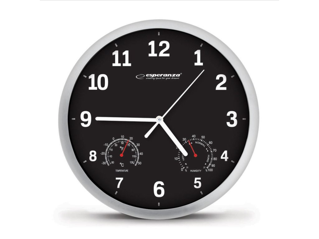 Esperanza EHC016K hodiny nástěnné LYON průměr 25cm teplota vlhkost bílá - černý ciferník