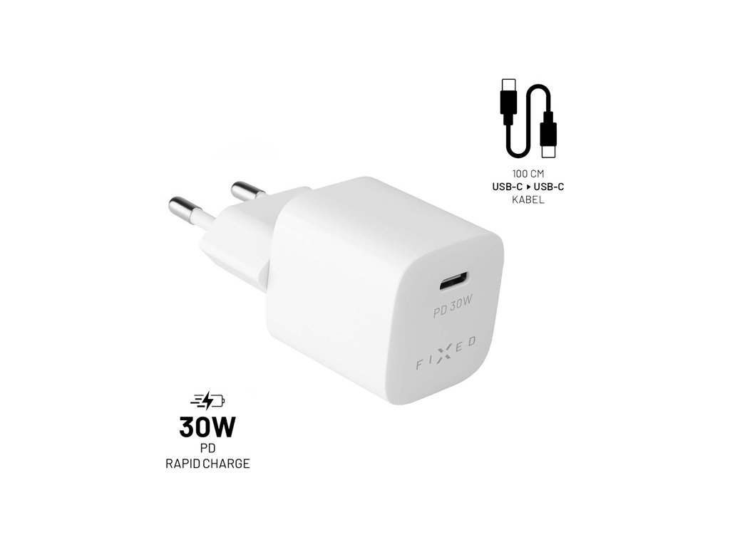 Set miniaturní síťové nabíječky nové generace FIXED s výkonem 30W a kabelu s konektory USB-C se postará o rychlé a bezpečné doplnění energie ve vašem moderním smartphonu, tabletu nebo menšího notebooku.Doplňkové parametry
