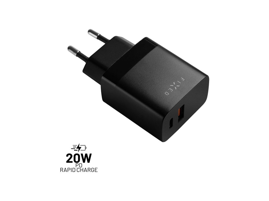 Síťová nabíječka FIXED s USB-C a USB výstupem, podpora PD a QC 3.0, 20W, černá