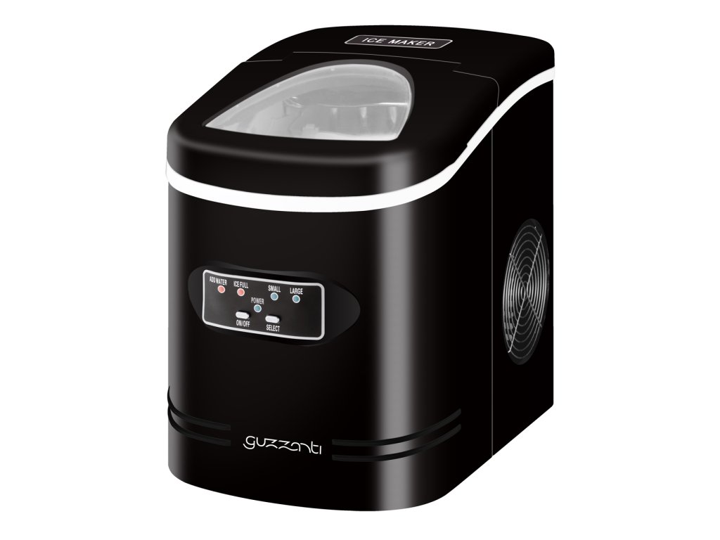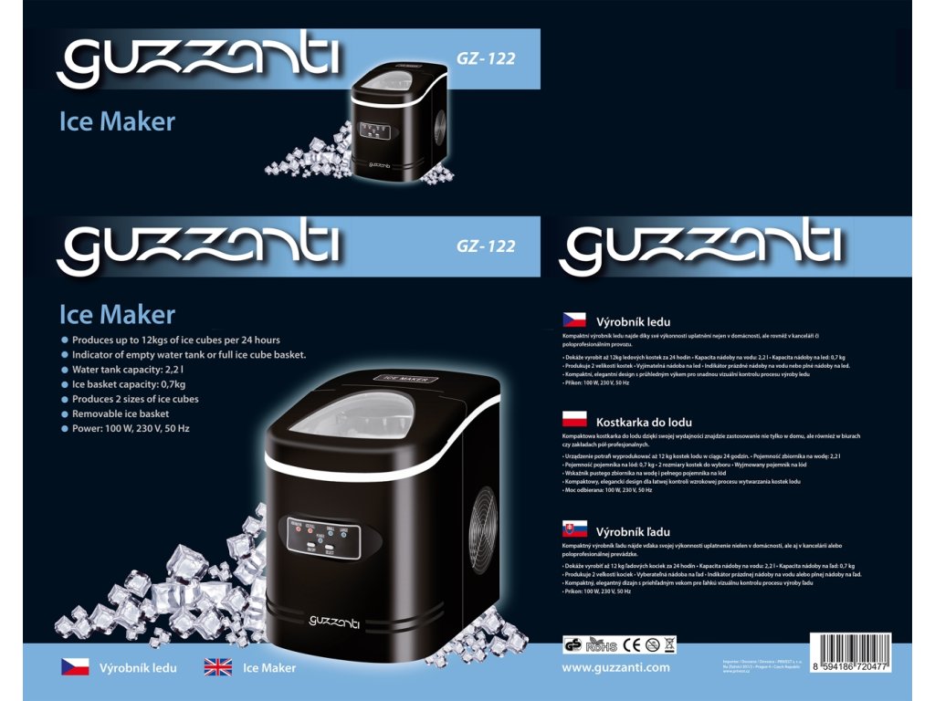 Výrobník ledu Guzzanti GZ 122. Dokáže vyrobit až 12 kg ledových kostek za 24 hodin. Kapacita nádoby na vodu: 2,2 l. Produkuje 2 velikosti kostek. Indikátor prázdné nádoby. Kompaktní, elegantní design. Příkon: 100 W. Rozměry (VxŠxH) 32,8x24,2x35,8cm. Barva černáDoplňkové parametry