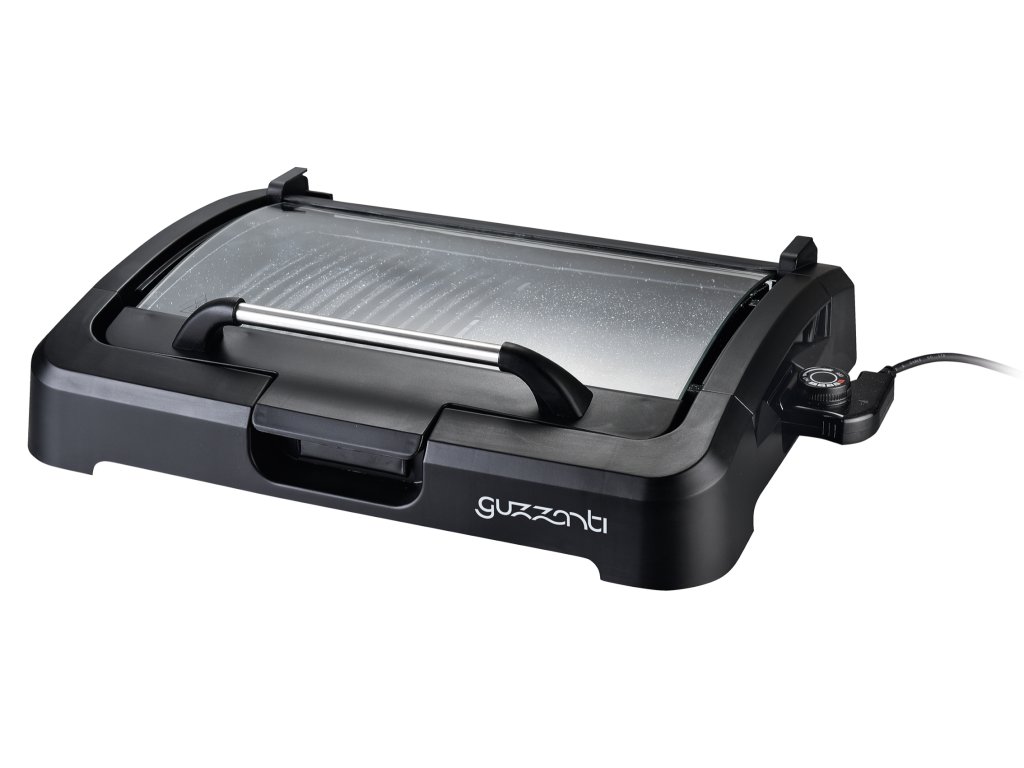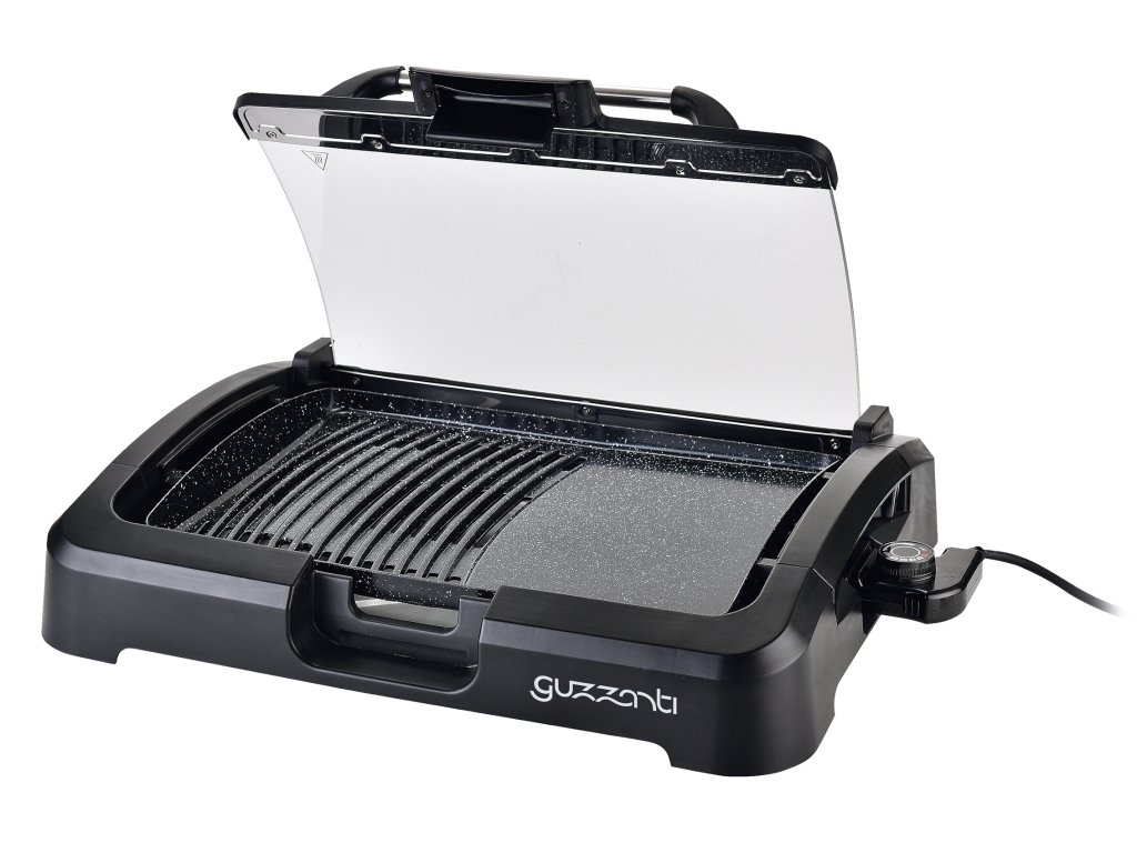 Stolní gril Guzzanti GZ 343; velká grilovací deska s nepřilnavým keramickým povrchem (39 x 29 cm); samostatná deska se zapuštěným topným tělesem pro snadné čištění ; odnímatelné skleněné víko s madlem pro urychlení přípravy pokrmů ; zámek víka pro snadné přenášení; nadbytečný tuk odtéká doDoplňkové parametry