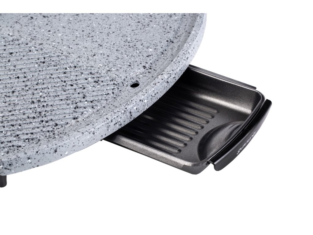 velká grilovací deska z masivní slitiny s nepřilnavým granitovým povrchem (48 x 35 cm)• vyjímatelná deska se zapuštěným topným tělesem pro snadné čištění • poklop pro urychlení přípravy pokrmů • rychlý ohřev na vysokou teplotu 250 °C• nadbytečný tuk odtéká do samostatné nádobyDoplňkové parametry
