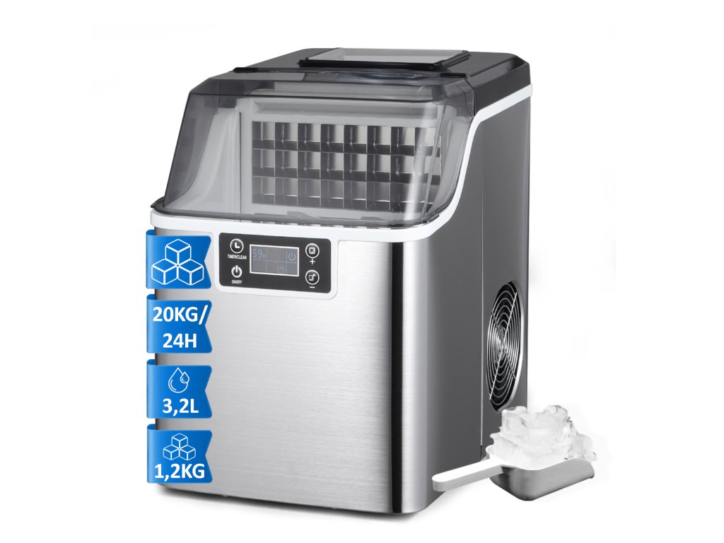 Kompaktní výrobník ledu najde díky své výkonnosti uplatnění nejen v domácnosti, ale rovněž v kanceláři či poloprofesionálním provozu. Dokáže vyrobit až 20 kg čirých ledových kostek za 24 hodin Kapacita nádoby na vodu: 3,2 l Kapacita nádoby na led: 1,2 kg Produkuje hDoplňkové parametry