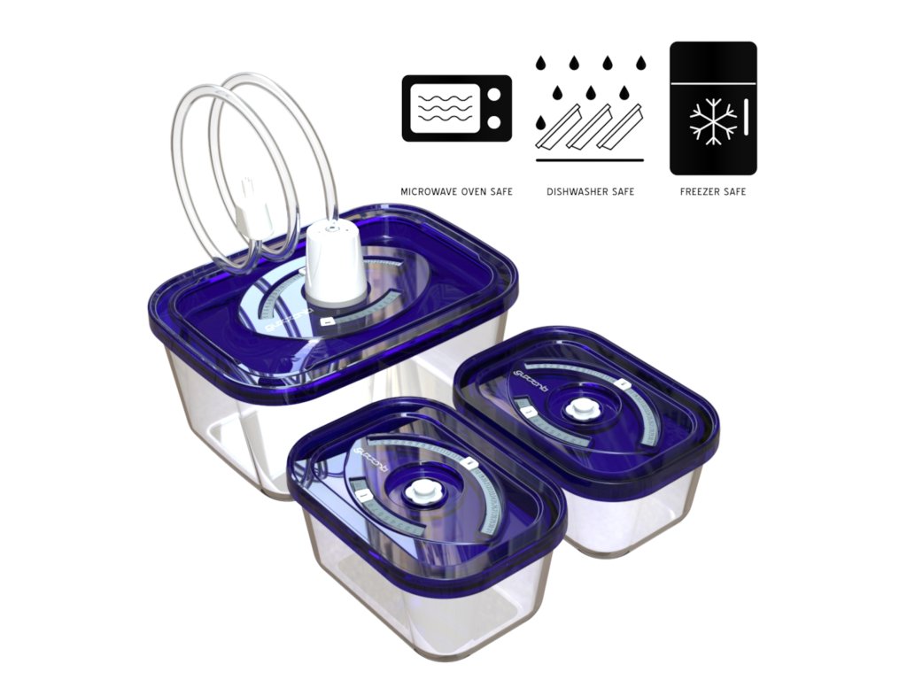 Set 3 skleněných vakuovacích nádob s hadičkou pro připojení k vakuovačce• 2 x 500 ml + 1 x 1500 ml a adaptér• Určené k vakuovým svářečkám potravin Guzzanti• Zdravotně nezávadné a certifikované materiály, sklo, ABS a silikon• Možnost vyznačení dne a měsíce na víku náDoplňkové parametry