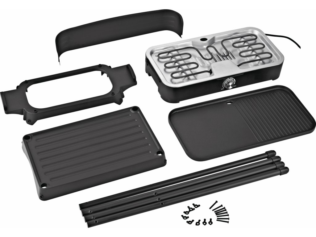 žebrovaná grilovací plocha s nepřilnavým povrchem (50 x 25 cm) vyjímatelná deska pro snadné čištění s integrovaným odtokem přebytečného tuku nadbytečný tuk odtéká do samostatné nádoby - příprava pokrmů s minimem tuku plynulá regulace teploty s otočným ovladačem proDoplňkové parametry