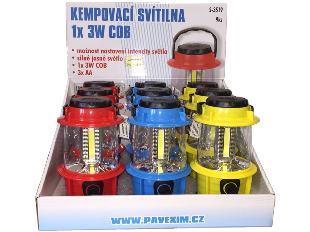 (BAL:1/9ks) 3W LED COB čipy, 120lm. Plynulá regulace intenzity otočným ovladačem. Silné jasné světlo. Madlo pro přenášení. rozměr: 85x165x85mm. 3xAA SOUČÁSTÍ BALENÍ. Barva: ŽLUTÁ, MODRÁ, ČERVENÁDoplňkové parametry