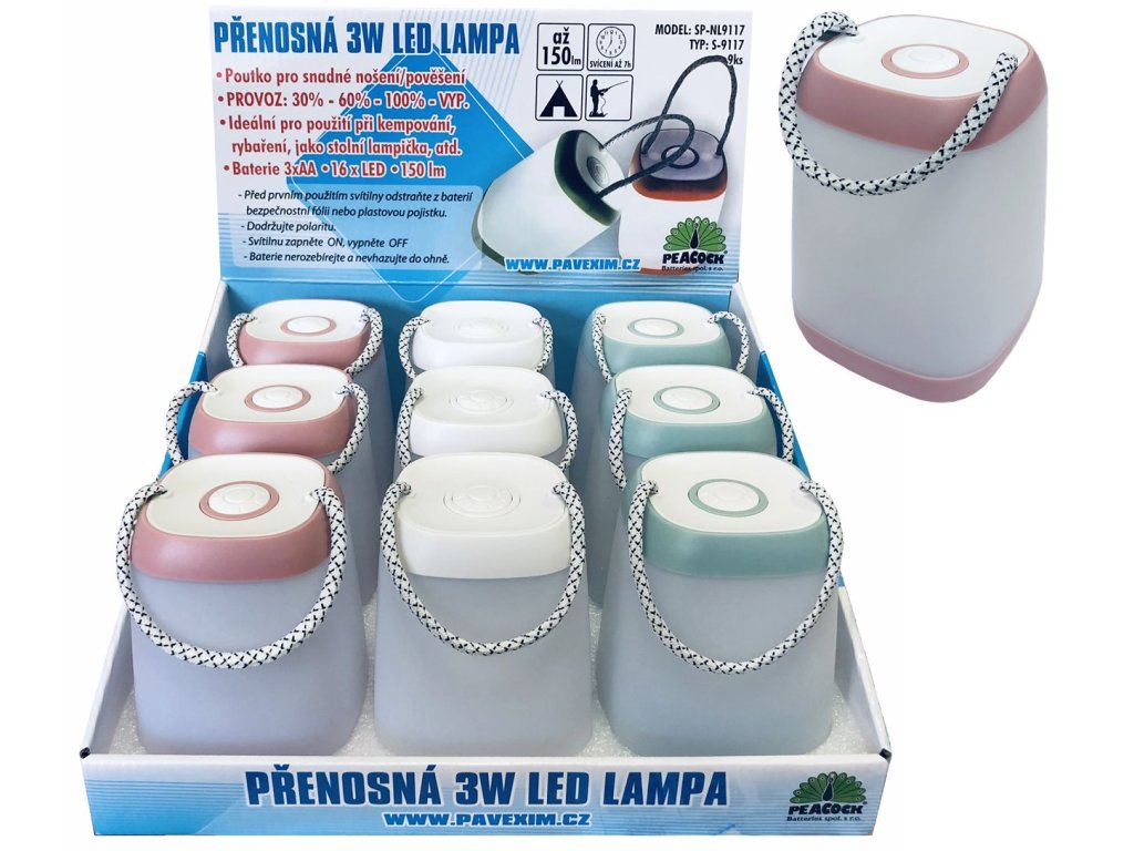 (BAL:1/9/27ks) 3W LED přenosná lampa, ideální pro použití při kempování, rybaření, jako stolní lampička. 150lm. Provozní režimy: 30% - 60% - 100%. . Poutko pro snadné nošení/pověšení. . Rozměr: 95x130x95mm. Svícení až 7hod. Napájení: 3xAA součástí balení. Barva: RŮŽOVÁ, BÍLÁ, ZELENÁ.Doplňkové parametry