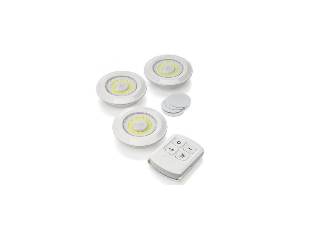 (BAL:1/12/72) LED COB noční svítidlo 3ks s dálkovým ovládáním.Ovládání: zap./vyp. na každém svítidle nebo dálkovým ovladačem: zap./50%/časovač 30min./vyp. Pokud jsou všechna svítidla v bezprostřední blízkosti u sebe, ovládají se ovladačem všechna na jednou.Pokud jsou svítidla v dostatečné vzdálenosti od sebe, ovládá se každé zvlášť.Zdroj světla: COB LED 3W - 150lmRozměry svítidla: průměr 90mm x výška 20mm,Napájení: svítidla 3xAAA, ovladač 2xAAA (baterie nejsou součástí),Součástí balení: dálkový ovladač, drzák na ovladač,Instalace: přilepení oboustrannou páskou (3M páska součástí), přišroubování,Barva: bílá,Balení: blistr (set 3x svítidlo, 1x ovladač)Doplňkové parametry