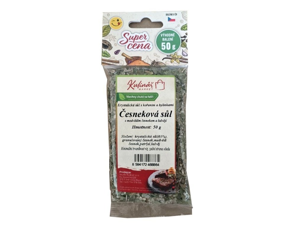(BAL:1/20) Česneková sůl mlýnek 60g. Krystalická sůl s kořením a bylinkami ozvláštní a ochutí váš talíř.Granulovaný česnek nejvyšší kvality, sušený medvědí česnek a trochu šalvěje přidají soli jemné česnekovo-bylinkové aroma a příjemnou chuť.- doporučujeme na grilovanou zeleninu i saláty – pro uzení ryb – do česnekového chleba a pečiv.Složení: krystalická sůl (65 %), granulovaný česnek, medvědí česnek, petržel, šalvěj. Určeno do mlýnku Kulinář či jiných mlýnků na kořeníBalení: sáček se závěsem.Doplňkové parametry
