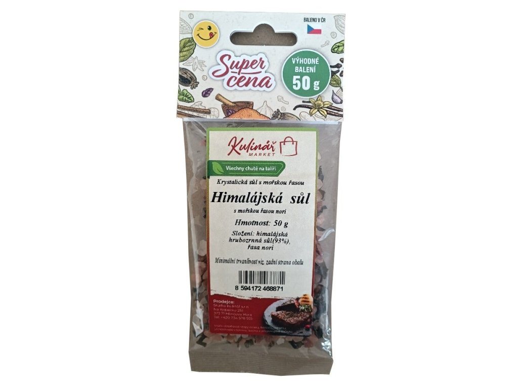 (BAL:1/20) Himalájská sůl originální náplň pro mlýnek 50g. Krystalická himalájská sůl s mořskou řasou.Zdravější přisolení. Mořské řasy jsou i v malém množství velmi dobrým zdrojem cenným živin a zvláště pak mnohých minerálů. Ve spojení s himalájskou solí tvoří doslova zdravou sůl. Složení: himalájská hrubozrnná sůl (93 %), řasa nori. Určeno do mlýnku Kulinář či jiných mlýnků na koření. Balení: sáček se závěsem.Doplňkové parametry