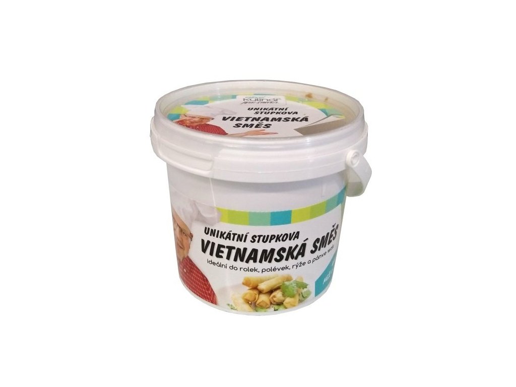 (BAL:1/6) Unikátní Stupkova vietnamská směs. Ideální do rolek, polévek, rýže, a pánve wok.Kořenící přípravek sypký.Složení: cibule, mořská sůl max. 15%, mrkev, česnek, citronová tráva, zázvor, koriandr, libeček, paprika, koriandr nať, kurkuma.Hmotnost: 70g.Světová kuchyně: asijská.Doplňkové parametry