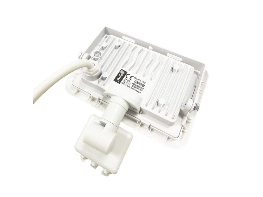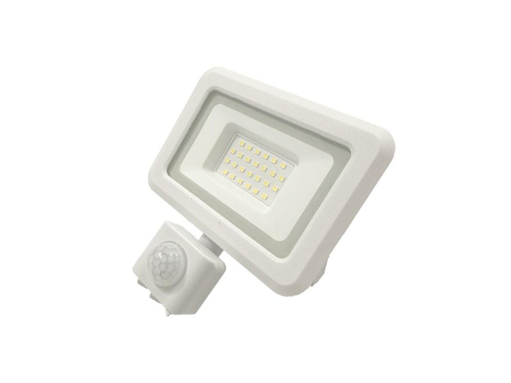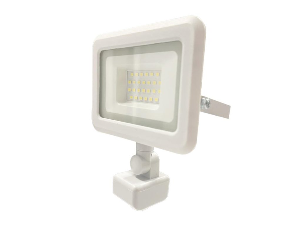 LED reflektor LF0122S v bílé barvě, s výkonem 20W, svítivostí 1600Lm a barvou světla 4000K, disponuje držákem, senzorem a vysoce kvalitním LED čipem.
