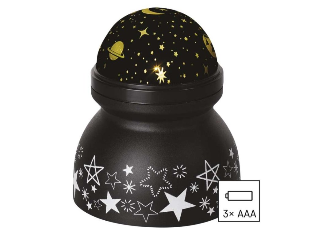 barva světla: teplá bílá|časovač: ne|dálkový ovladač: ne|délka přívodu: neuvádí se|funkce: rotující světlo|krytí: IP20|materiál: plast|použití: vnitřní|příkon: 2 W|prodejní obal: 1 ks, krabice|produkt: projektor|technologie: LED|typ napájení: baterie 3× AAA (není součástí balení)|vstupní napětí: neuvádí se|výstupní napětí: 4,5 V DC|vzor: hvězdy|záruční doba: 2 roky|životnost: 10 000 hodinDoplňkové parametry