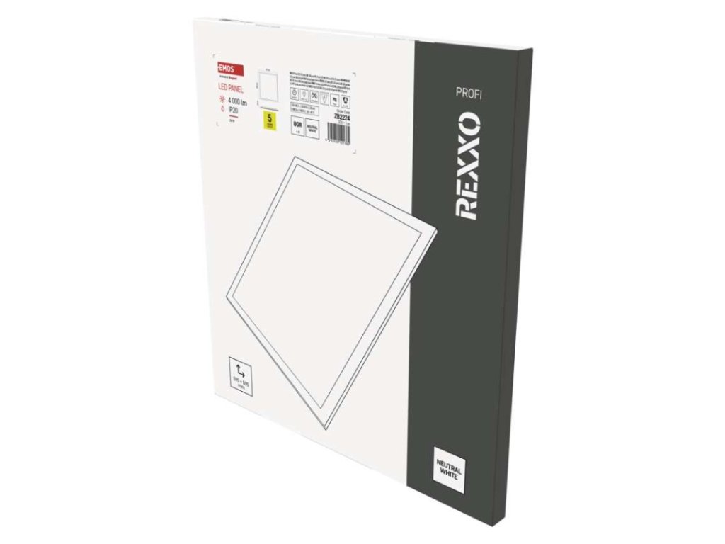 barva světla: neutrální bílá|barva těla: bílá|dálkový ovladač: ne|další funkce: –|do chodby a na schodiště: ne|do dílny a garáže: ne|do kanceláře: ano|do koupelny: ne|do kuchyně: ne|do obýváku, ložnice a dětského pokoje: ne|dosah senzoru: –|flicker-free: ano|frekvence: 50/60 Hz|index podání barev (CRI): Ra > 80|jazyky aplikace: –|kategorie: PROFI|kompatibilita: –|krytí: IP20|materiál difuzoru: plast (PC)|materiál LGP: –|materiál těla: ocelový plech|montážní otvor: –|možnost stmívání: ne|náhrada za žárovku: 4× 18 W CFL|napětí: 220–240 V|na zahradu a balkon: ne|notifikace do mobilní aplikace: –|obsah balení: –|ovládání hlasovými asistenty: –|podporované OS: –|pohybový senzor: ne|přenosová frekvence: –|příkon: 36 W|prodejní obal: 1 ks, krabice|protokol: –|proud: 155 mA|řada: REXXO|rozměr: 595 × 595 × 24 mm|světelná účinnost: 110 lm/W|světelný tok: 4 000 lm|teplota chromatičnosti: 4 000 K|tvar: čtverec|typ difuzoru: mléčný|typ svítidla: panel|účiník: > 0,9|UGR<: 19|úhel vyzařování: 90°|umístění: stropní|výstupní proud ze zdroje: 850 mA|záruční doba: 5 let|zdroj světla: LED|životnost: 50 000 hodin|způsob montáže: vestavnéDoplňkové parametry
