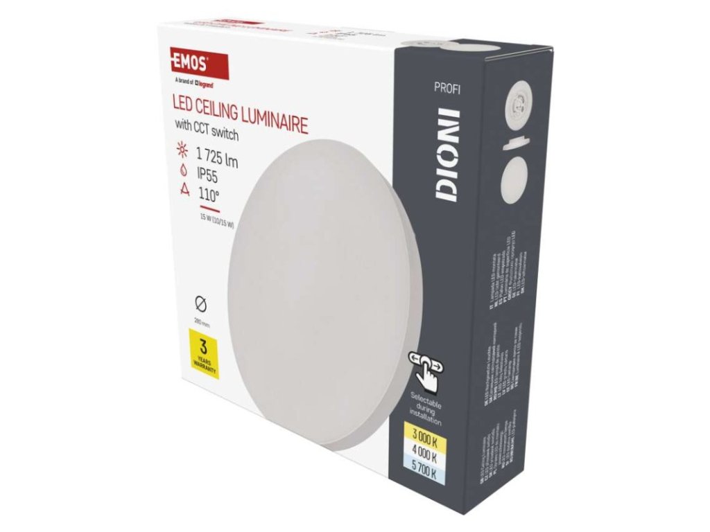 barva světla: teplá/neutrální/studená bílá|barva těla: bílá|dálkový ovladač: ne|další funkce: –|do chodby a na schodiště: ano|do dílny a garáže: ne|do kanceláře: ano|do koupelny: ano|do kuchyně: ano|do obýváku, ložnice a dětského pokoje: ano|dosah senzoru: neuvádí se|flicker-free: nebliká|frekvence: 50/60 Hz|index podání barev (CRI): Ra > 80|jazyky aplikace: –|kategorie: PROFI|kompatibilita: –|krytí: IP55|materiál difuzoru: plast|materiál LGP: neuvádí se|materiál těla: plast|montážní otvor: ne|možnost stmívání: ne|náhrada za žárovku: 110 W|napětí: 220–240 V~|na zahradu a balkon: ano|notifikace do mobilní aplikace: ne|obsah balení: –|ovládání hlasovými asistenty: ne|podporované OS: –|pohybový senzor: ne|přenosová frekvence: –|příkon: 15 W|prodejní obal: 1 ks, krabice|protokol: –|proud: 62 mA|řada: DIONI|rozměr: průměr 280 × 62 mm|světelná účinnost: 115 lm/W|světelný tok: 1 725 lm|teplota chromatičnosti: 3 000/4 000/5 700 K|tvar: kruh|typ difuzoru: mléčný|typ svítidla: klasické svítidlo|účiník: > 0,8|UGR<: neuvádí se|úhel vyzařování: 110°|umístění: stropní/nástěnné|výstupní proud ze zdroje: neuvádí se|záruční doba: 3 roky|zdroj světla: LED|životnost: 30 000 hodin|způsob montáže: přisazené/závěsnéDoplňkové parametry