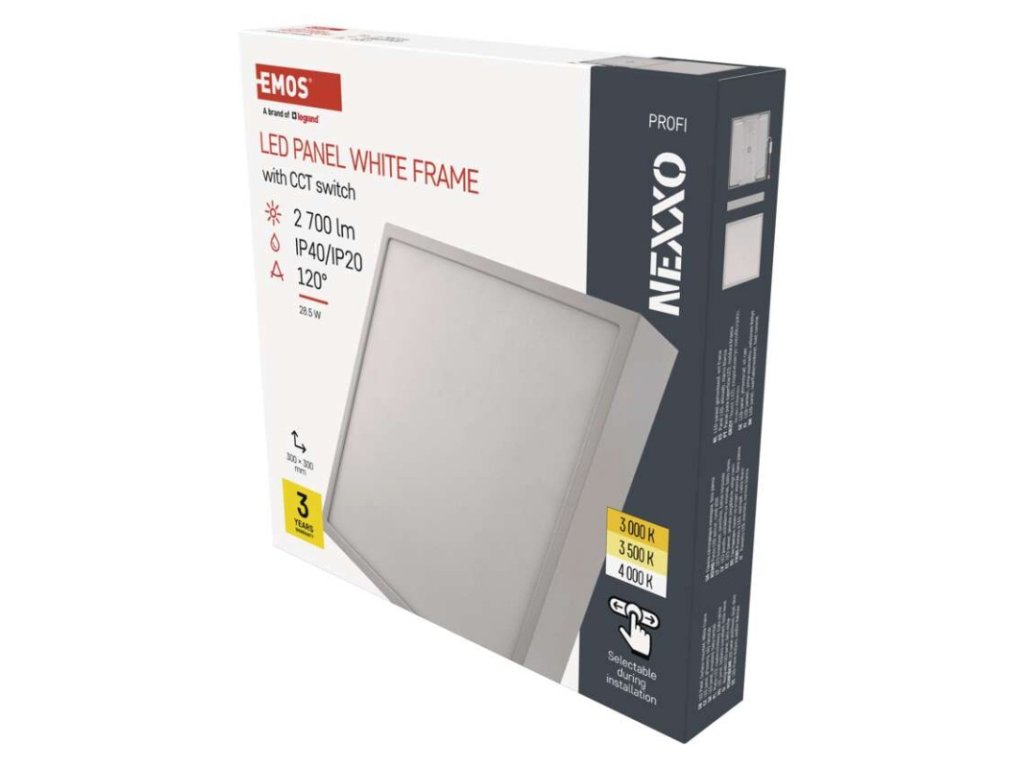 barva světla: teplá bílá–neutrální bílá|barva těla: bílá|dálkový ovladač: ne|do chodby a na schodiště: ano|do dílny a garáže: ne|do kanceláře: ano|do koupelny: ne|do kuchyně: ano|do obýváku, ložnice a dětského pokoje: ano|dosah senzoru: nemá senzor|flicker-free: ano|frekvence: 50/60 Hz|index podání barev (CRI): Ra > 80|kategorie: PROFI|krytí: IP40/IP20|materiál difuzoru: plast (PMMA)|materiál LGP: PMMA|materiál těla: ocelový plech|montážní otvor: neuvádí se|možnost stmívání: ne|náhrada za žárovku: 160 W|napětí: 220–240 V|na zahradu a balkon: ne|pohybový senzor: ne|příkon: 28,5 W|prodejní obal: 1 ks, krabice|proud: 700 mA|řada: NEXXO|rozměr: 300 × 300 × 42 mm|světelná účinnost: 95 lm/W|světelný tok: 2 700 lm|teplota chromatičnosti: 3 000/3 500/4 000 K|tvar: čtverec|typ difuzoru: mléčný|typ svítidla: klasické svítidlo|účiník: > 0,9|UGR<: neuvádí se|úhel vyzařování: 120°|umístění: stropní/nástěnné|výstupní proud ze zdroje: neuvádí se|záruční doba: 3 roky|zdroj světla: LED|životnost: 30 000 hodin|způsob montáže: přisazenéDoplňkové parametry