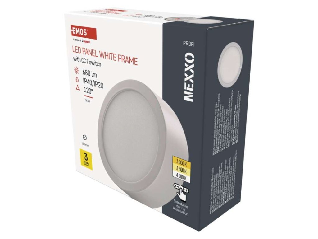 barva světla: teplá bílá–neutrální bílá|barva těla: bílá|dálkový ovladač: ne|do chodby a na schodiště: ano|do dílny a garáže: ne|do kanceláře: ano|do koupelny: ne|do kuchyně: ano|do obýváku, ložnice a dětského pokoje: ano|dosah senzoru: nemá senzor|flicker-free: ano|frekvence: 50/60 Hz|index podání barev (CRI): Ra > 80|kategorie: PROFI|krytí: IP40/IP20|materiál difuzoru: plast (PMMA)|materiál LGP: PMMA|materiál těla: ocelový plech|montážní otvor: neuvádí se|možnost stmívání: ne|náhrada za žárovku: 50 W|napětí: 220–240 V|na zahradu a balkon: ne|pohybový senzor: ne|příkon: 7,6 W|prodejní obal: 1 ks, krabice|proud: 300 mA|řada: NEXXO|rozměr: průměr 120 × 40 mm|světelná účinnost: 90 lm/W|světelný tok: 680 lm|teplota chromatičnosti: 3 000/3 500/4 000 K|tvar: kruh|typ difuzoru: mléčný|typ svítidla: klasické svítidlo|účiník: > 0,5|UGR<: neuvádí se|úhel vyzařování: 120°|umístění: stropní/nástěnné|výstupní proud ze zdroje: neuvádí se|záruční doba: 3 roky|zdroj světla: LED|životnost: 30 000 hodin|způsob montáže: přisazenéDoplňkové parametry