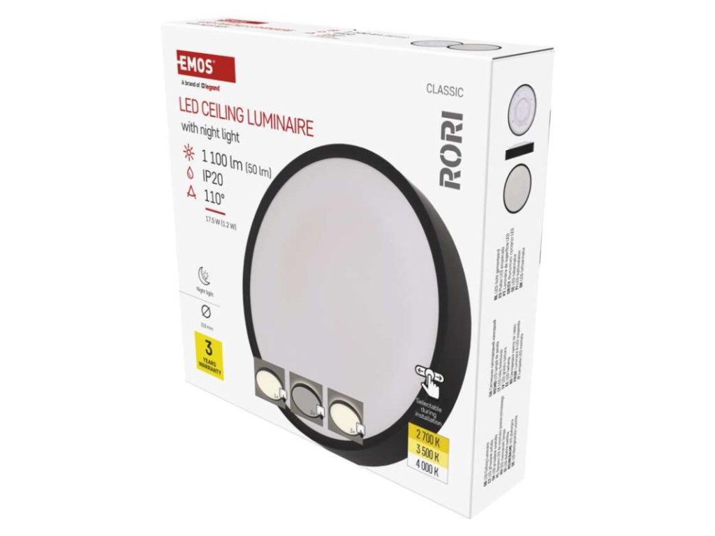 barva světla: teplá/neutrální bílá|barva těla: černá|dálkový ovladač: ne|další funkce: –|do chodby a na schodiště: ano|do dílny a garáže: ne|do kanceláře: ne|do koupelny: ano|do kuchyně: ano|do obýváku, ložnice a dětského pokoje: ano|dosah senzoru: neuvádí se|flicker-free: ano|frekvence: 50/60 Hz|index podání barev (CRI): Ra > 80|jazyky aplikace: –|kategorie: CLASSIC|kompatibilita: –|krytí: IP20|materiál difuzoru: plast|materiál LGP: neuvádí se|materiál těla: ocelový plech|montážní otvor: neuvádí se|možnost stmívání: ne|náhrada za žárovku: 100 W|napětí: 220–240 V~|na zahradu a balkon: ne|notifikace do mobilní aplikace: ne|obsah balení: –|ovládání hlasovými asistenty: ne|podporované OS: –|pohybový senzor: neuvádí se|přenosová frekvence: –|příkon: 17 W|prodejní obal: 1 ks, krabice|protokol: –|proud: 118 mA|řada: RORI|rozměr: průměr 310 × 75 mm|světelná účinnost: 62 lm/W|světelný tok: 1 100 lm|teplota chromatičnosti: 2 700/3 500/4 000 K|tvar: kruh|typ difuzoru: mléčný|typ svítidla: klasické svítidlo|účiník: > 0,5|UGR<: neuvádí se|úhel vyzařování: 110°|umístění: stropní/nástěnné|výstupní proud ze zdroje: neuvádí se|záruční doba: 3 roky|zdroj světla: LED|životnost: 30 000 hodin|způsob montáže: přisazenéDoplňkové parametry
