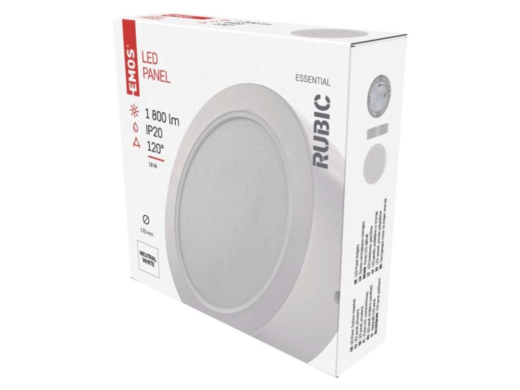 barva světla: neutrální bílá|barva těla: bílá|dálkový ovladač: ne|do chodby a na schodiště: ano|do dílny a garáže: ano|do kanceláře: ne|do koupelny: ne|do kuchyně: ano|do obýváku, ložnice a dětského pokoje: ne|dosah senzoru: nemá senzor|flicker-free: ano|frekvence: 50/60 Hz|index podání barev (CRI): Ra > 80|kategorie: ESSENTIAL|krytí: IP20|materiál difuzoru: plast (PC)|materiál LGP: neuvádí se|materiál těla: plast (PC)|montážní otvor: neuvádí se|možnost stmívání: ne|náhrada za žárovku: 110 W|napětí: 220–240 V|na zahradu a balkon: ne|pohybový senzor: ne|příkon: 18 W|prodejní obal: 1 ks, krabice|proud: 157 mA|řada: RUBIC|rozměr: průměr 170 × 42 mm|světelná účinnost: 100 lm/W|světelný tok: 1 800 lm|teplota chromatičnosti: 4 000 K|tvar: kruh|typ difuzoru: mléčný|typ svítidla: klasické svítidlo|účiník: > 0,7|UGR<: neuvádí se|úhel vyzařování: 120°|umístění: stropní/nástěnné|výstupní proud ze zdroje: 50 mA|záruční doba: 2 roky|zdroj světla: LED|životnost: 25 000 hodin|způsob montáže: přisazenéDoplňkové parametry