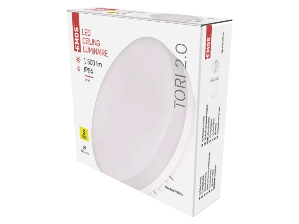 barva světla: neutrální bílá|barva těla: bílá|dálkový ovladač: ne|do chodby a na schodiště: ano|do dílny a garáže: ano|do kanceláře: ne|do koupelny: ano|do kuchyně: ano|do obýváku, ložnice a dětského pokoje: ne|dosah senzoru: neuvádí se|flicker-free: ano|frekvence: 50/60 Hz|index podání barev (CRI): Ra > 80|kategorie: CLASSIC|krytí: IP54|materiál difuzoru: plast (PC)|materiál LGP: neuvádí se|materiál těla: plast (PC)|montážní otvor: neuvádí se|možnost stmívání: ne|náhrada za žárovku: 100 W|napětí: 220–240 V|na zahradu a balkon: ano|pohybový senzor: ne|příkon: 15 W|prodejní obal: 1 ks, krabice|proud: 200 mA|řada: TORI|rozměr: průměr 220 × 53 mm|světelná účinnost: 100 lm/W|světelný tok: 1 500 lm|teplota chromatičnosti: 4 000 K|tvar: kruh|typ difuzoru: mléčný|typ svítidla: klasické svítidlo|účiník: > 0,9|UGR<: neuvádí se|úhel vyzařování: 120°|umístění: stropní/nástěnné|výstupní proud ze zdroje: neuvádí se|záruční doba: 3 roky|zdroj světla: LED|životnost: 30 000 hodin|způsob montáže: přisazenéDoplňkové parametry