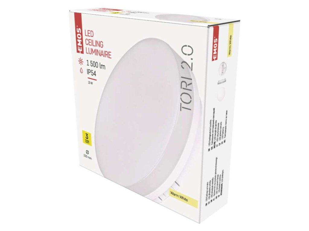 barva světla: teplá bílá|barva těla: bílá|dálkový ovladač: ne|do chodby a na schodiště: ano|do dílny a garáže: ano|do kanceláře: ne|do koupelny: ano|do kuchyně: ano|do obýváku, ložnice a dětského pokoje: ne|dosah senzoru: neuvádí se|flicker-free: ano|frekvence: 50/60 Hz|index podání barev (CRI): Ra > 80|kategorie: CLASSIC|krytí: IP54|materiál difuzoru: plast (PC)|materiál LGP: neuvádí se|materiál těla: plast (PC)|montážní otvor: neuvádí se|možnost stmívání: ne|náhrada za žárovku: 80 W|napětí: 220–240 V|na zahradu a balkon: ano|pohybový senzor: ne|příkon: 15 W|prodejní obal: 1 ks, krabice|proud: 200 mA|řada: TORI|rozměr: průměr 220 × 53 mm|světelná účinnost: 83 lm/W|světelný tok: 1 500 lm|teplota chromatičnosti: 3 000 K|tvar: kruh|typ difuzoru: mléčný|typ svítidla: klasické svítidlo|účiník: > 0,9|UGR<: neuvádí se|úhel vyzařování: 120°|umístění: stropní/nástěnné|výstupní proud ze zdroje: neuvádí se|záruční doba: 3 roky|zdroj světla: LED|životnost: 30 000 hodin|způsob montáže: přisazenéDoplňkové parametry