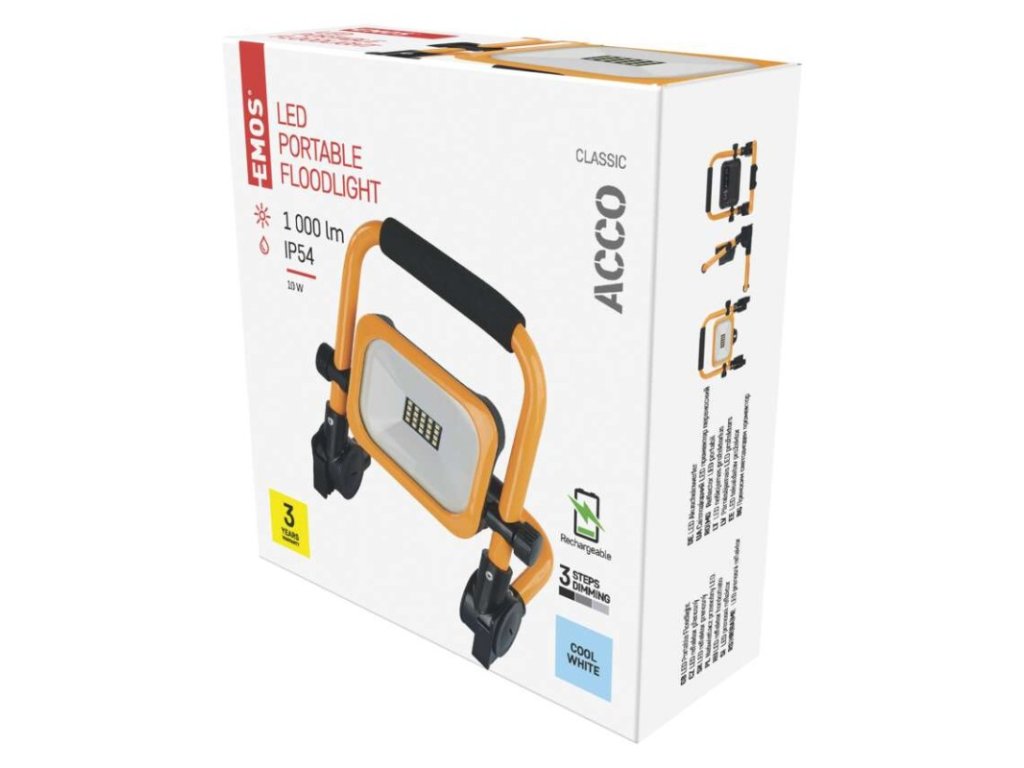 akumulátor: Li-Ion 4 400 mAh|barva: žlutá|barva světla: studená bílá|délka přívodního kabelu: neuvádí se|doba svícení na AKU: 3 – 10 hodin|dosah PIR senzoru: nemá PIR|energetická třída použitého světelného zdroje: neuvádí se|flicker-free: ano|frekvence: neuvádí se|index podání barev (CRI): Ra > 80|kategorie: CLASSIC|krytí: IP54|materiál difuzoru: sklo|materiál přívodního kabelu: neuvádí se|materiál těla: hliník|napájení: akumulátor|napětí: 5 V DC 220–240 V AC|PIR senzor: ne|počet průchozích zásuvek: 0|použití: přenosné|příkon: 10 W|prodejní obal: 1 ks, krabice|proud: 1 000 mA|řada: ACCO|rozměr: 212 × 177 × 224 mm|rozsah pracovní teploty: -20 °C až +40 °C|stmívání: ano|stupeň ochrany proti mechanickým nárazům: neuvádí se|světelná účinnost: 100 lm/W|světelný tok: 1 000 lm|teplota chromatičnosti: 6 500 K|typ přívodního kabelu: neuvádí se|typ průchozích zásuvek: neuvádí se|účiník: > 0,9|úhel vyzařování: 120°|záruční doba: 3 roky|zdroj světla: LED|životnost: 25 000 hodin|zkušební žárovka součástí balení: neuvádí seDoplňkové parametry