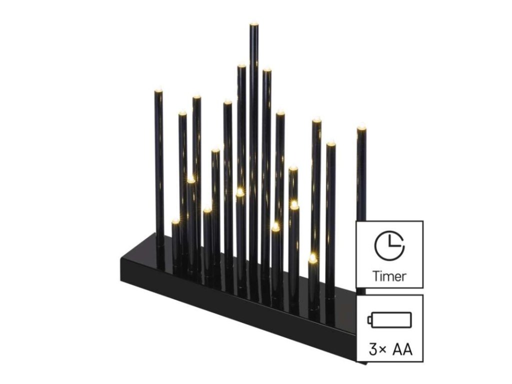 barva drátu: neuvádí se|barva světla: teplá bílá|časovač: ano|dálkový ovladač: ne|délka přívodu: neuvádí se|krytí: IP20|materiál: plast|počet LED: 20|použití: vnitřní|příkon: 1,2 W|prodejní obal: 1 ks, krabice|produkt: svícen|rozměr: 25 × 27,5 cm|typ napájení: baterie 3× AA (není součástí balení)|vstupní napětí: neuvádí se|výstupní napětí: 4,5 V DC|záruční doba: 2 roky|zdroj svícení: LED|životnost: 10 000 hodinDoplňkové parametry