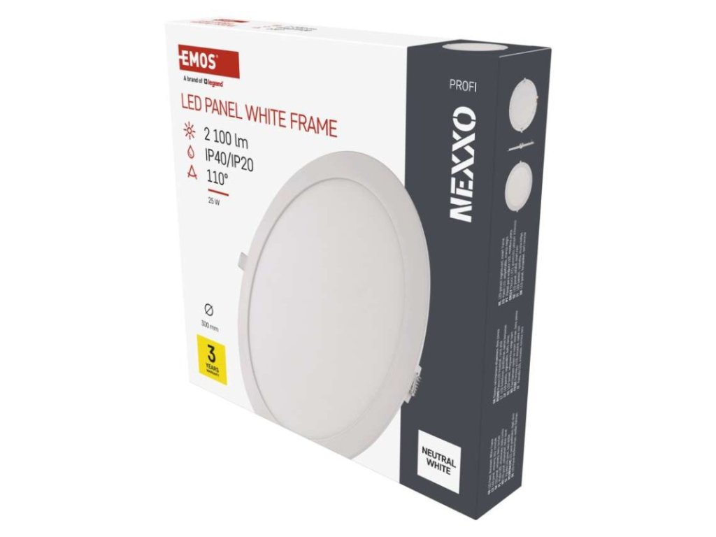 barva světla: neutrální bílá|barva těla: bílá|dálkový ovladač: ne|do chodby a na schodiště: ano|do dílny a garáže: ne|do kanceláře: ano|do koupelny: ne|do kuchyně: ano|do obýváku, ložnice a dětského pokoje: ano|dosah senzoru: nemá senzor|flicker-free: ano|frekvence: 50/60 Hz|index podání barev (CRI): Ra > 82|kategorie: PROFI|krytí: IP40/IP20|materiál difuzoru: plast (PS)|materiál LGP: PMMA|materiál těla: hliník|montážní otvor: 280 mm|možnost stmívání: ne|náhrada za žárovku: 125 W|napětí: 220–240 V|na zahradu a balkon: ne|pohybový senzor: ne|příkon: 25 W|prodejní obal: 1 ks, krabice|proud: 111 mA|řada: NEXXO|rozměr: průměr 300 × 21 mm|světelná účinnost: 83 lm/W|světelný tok: 2 100 lm|teplota chromatičnosti: 4 000 K|tvar: kruh|typ difuzoru: mléčný|typ svítidla: klasické svítidlo|účiník: > 0,9|UGR<: neuvádí se|úhel vyzařování: 110°|umístění: stropní|výstupní proud ze zdroje: 300 mA|záruční doba: 3 roky|zdroj světla: LED|životnost: 30 000 hodin|způsob montáže: vestavnéDoplňkové parametry