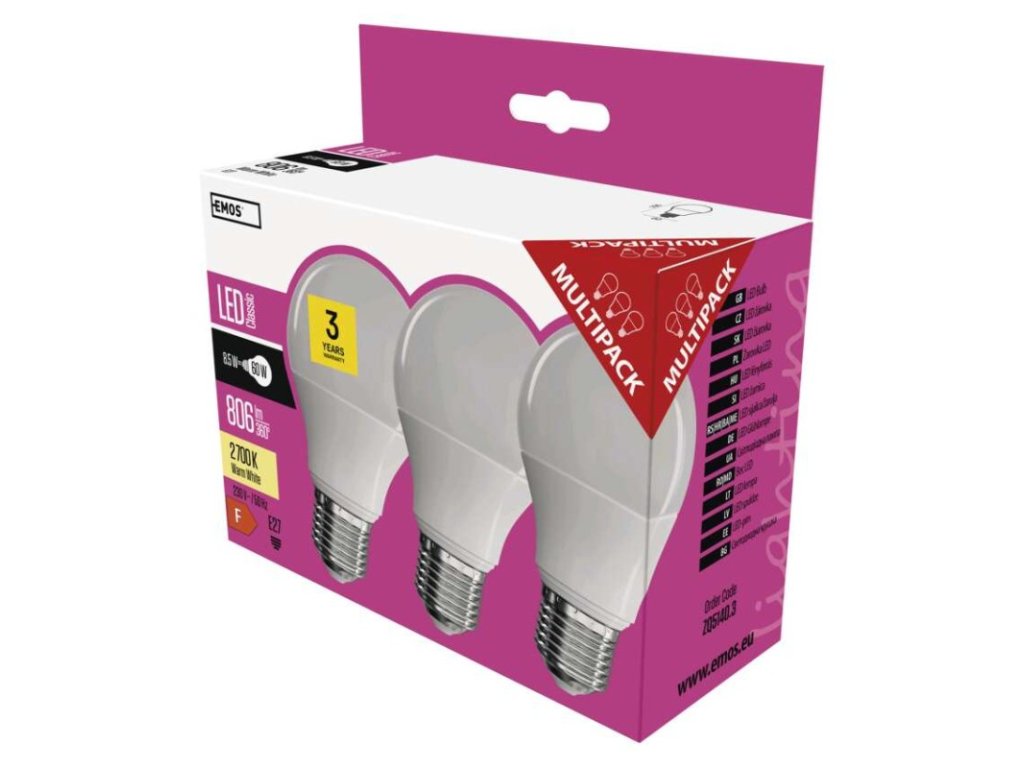barva světla: teplá bílá|energetická třída: F|index podání barev (CRI): 80|kompatibilita: –|náhrada za žárovku: 60 W|napětí: 230 V~/50 Hz|notifikace do mobilní aplikace: –|ovládání hlasovými asistenty: –|patice (uchycení žárovky): E27|počet čipů: neuvádí se|počet spínacích cyklů: 25 000|podporované OS: –|přenosová frekvence: –|příkon: 8,5 W|prodejní obal: 3 ks, krabička|protokol: –|řada: CLASSIC|rozměr: 106 × 60 × 60 mm|stmívatelná: ne|světelná účinnost: 95 lm/W|světelný tok: 806 lm|technologie: LED|teplota chromatičnosti: 2 700 K|tvar: A60|typ čipů: SMD|účiník: 0,53|úhel vyzařování: 180°|záruční doba: 3 roky|životnost: 30 000 hodinDoplňkové parametry