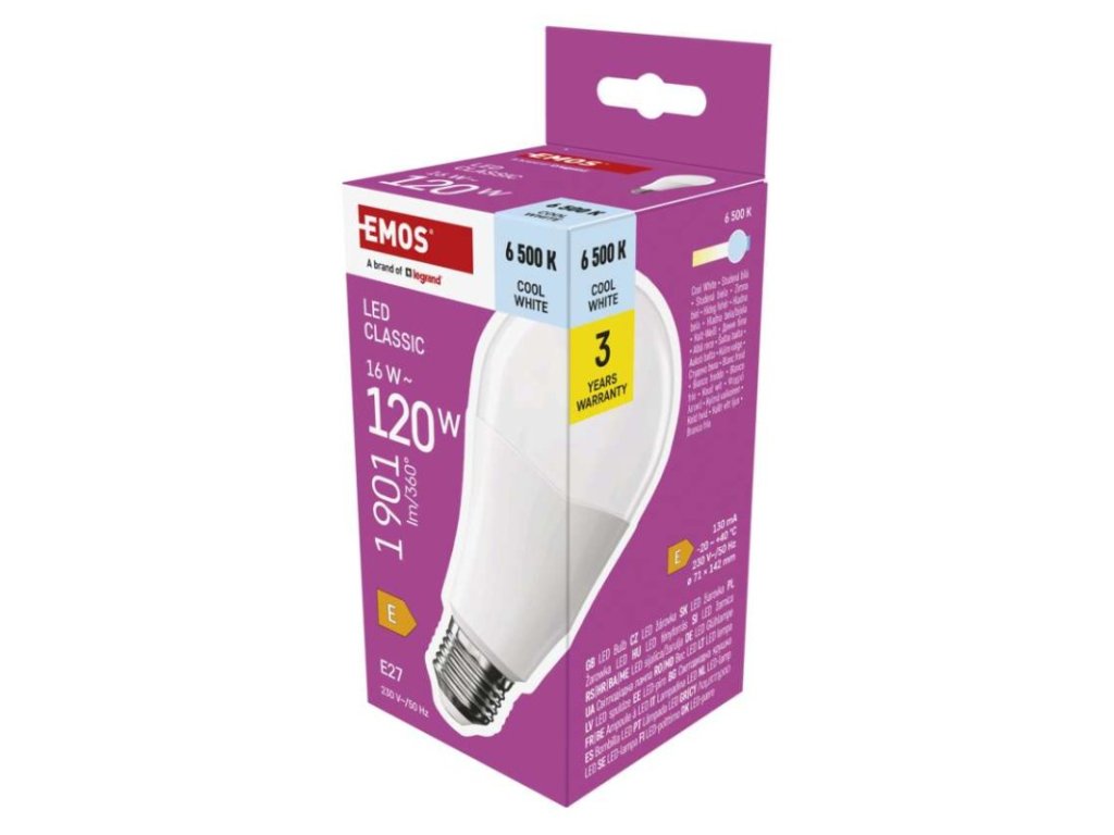 barva světla: studená bílá|energetická třída: E|index podání barev (CRI): 80|kompatibilita: –|náhrada za žárovku: 120 W|napětí: 230 V~/50 Hz|notifikace do mobilní aplikace: ne|ovládání hlasovými asistenty: ne|patice (uchycení žárovky): E27|počet čipů: neuvádí se|počet spínacích cyklů: 30 000|podporované OS: –|přenosová frekvence: –|příkon: 16 W|prodejní obal: 1 ks, krabička|protokol: –|řada: CLASSIC|rozměr: 71 × 71 × 142 mm|stmívatelná: ne|světelná účinnost: 119 lm/W|světelný tok: 1 901 lm|technologie: LED|teplota chromatičnosti: 6 500 K|tvar: A70|typ čipů: SMD|účiník: 0,50|úhel vyzařování: 180°|záruční doba: 3 roky|životnost: 30 000 hodinDoplňkové parametry