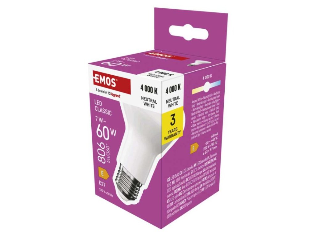barva světla: neutrální bílá|energetická třída: E|index podání barev (CRI): 80|kompatibilita: –|náhrada za žárovku: 60 W|napětí: 230 V~/50 Hz|notifikace do mobilní aplikace: ne|ovládání hlasovými asistenty: ne|patice (uchycení žárovky): E27|počet čipů: neuvádí se|počet spínacích cyklů: 30 000|podporované OS: –|přenosová frekvence: –|příkon: 7 W|prodejní obal: 1 ks, krabička|protokol: –|řada: CLASSIC|rozměr: 63 × 63 × 97 mm|stmívatelná: ne|světelná účinnost: 115 lm/W|světelný tok: 806 lm|technologie: LED|teplota chromatičnosti: 4 000 K|tvar: R63|typ čipů: SMD|účiník: 0,50|úhel vyzařování: 120°|záruční doba: 3 roky|životnost: 30 000 hodinDoplňkové parametry