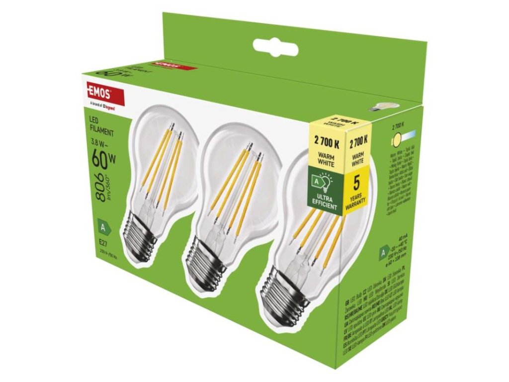 barva světla: teplá bílá|energetická třída: A|index podání barev (CRI): 80|kompatibilita: –|náhrada za žárovku: 60 W|napětí: 230 V~/50 Hz|notifikace do mobilní aplikace: –|ovládání hlasovými asistenty: –|patice (uchycení žárovky): E27|počet čipů: 4|počet spínacích cyklů: 30 000|podporované OS: –|přenosová frekvence: –|příkon: 3,8 W|prodejní obal: 3 ks, krabička|protokol: –|řada: FILAMENT|rozměr: 60 × 60 × 108 mm|stmívatelná: ne|světelná účinnost: 212 lm/W|světelný tok: 806 lm|technologie: LED|teplota chromatičnosti: 2 700 K|tvar: A60|typ čipů: COB|účiník: 0,5|úhel vyzařování: 360°|záruční doba: 5 let|životnost: 50 000 hodinDoplňkové parametry