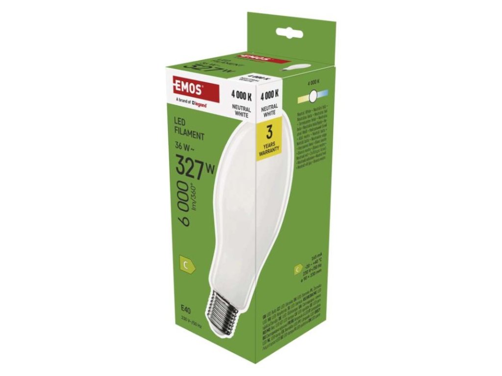 barva světla: neutrální bílá|energetická třída: C|index podání barev (CRI): 80|kompatibilita: neuvádí se|náhrada za žárovku: 327 W|napětí: 230 V~/50 Hz|notifikace do mobilní aplikace: neuvádí se|ovládání hlasovými asistenty: neuvádí se|patice (uchycení žárovky): E40|počet čipů: neuvádí se|počet spínacích cyklů: neuvádí se|podporované OS: neuvádí se|přenosová frekvence: neuvádí se|příkon: 36 W|prodejní obal: 1 ks, krabička|protokol: neuvádí se|řada: FILAMENT|rozměr: 90 × 90 × 230 mm|stmívatelná: ne|světelná účinnost: 167 lm/W|světelný tok: 6 000 lm|technologie: LED|teplota chromatičnosti: 4 000 K|tvar: ED90|typ čipů: COB|účiník: 0,97|úhel vyzařování: 330°|záruční doba: 3 roky|životnost: 25 000 hodinDoplňkové parametry