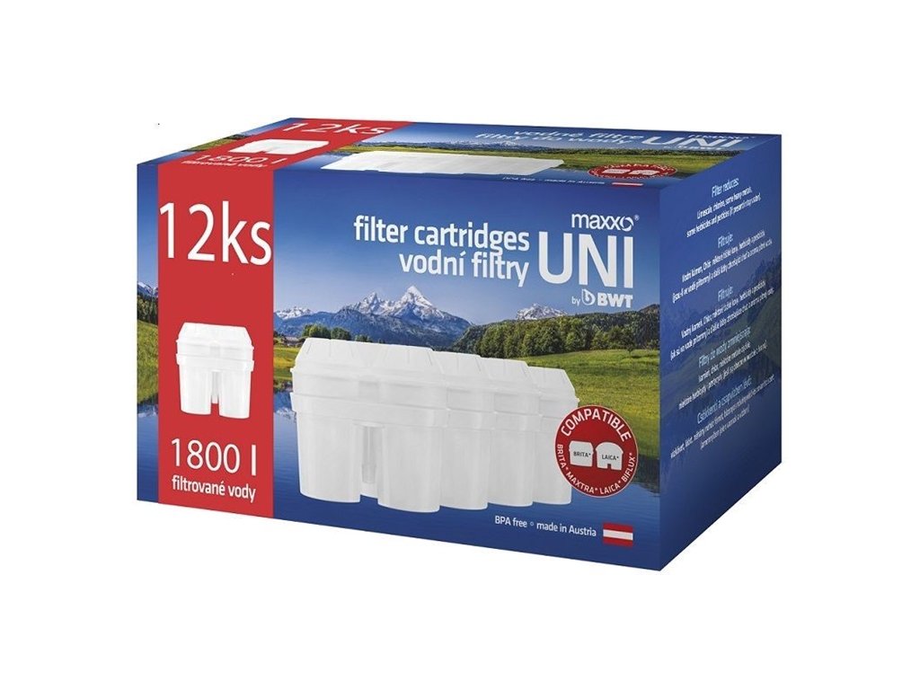 Filtry nové generace MAXXO UNI, balení 12ks– kompatibilní s filtračními systémy LAICA Biflux, Brita Maxtra, BWT a dalšími značkami filtračních konvic s oválným typem filtruOdstraňují nežádoucí látky, které negativně ovlivňují chuť a vzhled vody z kohoutku. Významně reDoplňkové parametry