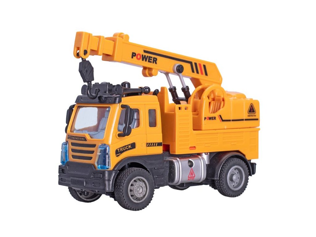 (BAL:1/48/96ks) Auto stavební jeřáb TRUCK plast 13cm na zpětný chod. S výsuvným a otočným ramenem. Barva: žlutá. Design: jeřáb. Rozměr: 13x9x6cm.Vhodné pro děti od 3 let.Materiál: plast.Balení: papírová krabička s průhledem.Doplňkové parametry