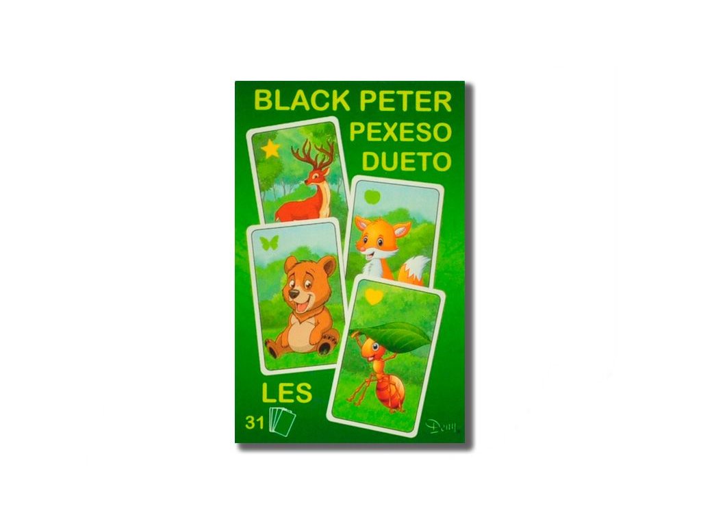 (BAL:1/200ks) Hrací karty Černý Petr Pexeso Dueto LES. 3 karetní hry.Hrací karty na hru Černý Petr / Pexeso / Dueto.Rozměry karet 7x10,5x1,5cm 31ks v krabičce.Balení obsahuje 31 karet.Vhodné pro děti od 3 let.Balení: papírová krabička.Doplňkové parametry