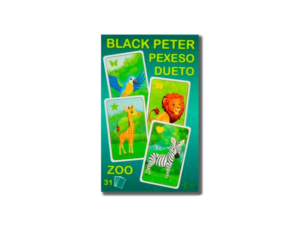 (BAL:1/200ks) Hrací karty Černý Petr Pexeso Dueto ZOO3 karetní hry.Hrací karty na hru Černý Petr / Pexeso / Dueto.Rozměry karet 7x10,5x1,5cm 31ks v krabičce.Balení obsahuje 31 karet.Vhodné pro děti od 3 let.Balení: papírová krabička.Doplňkové parametry