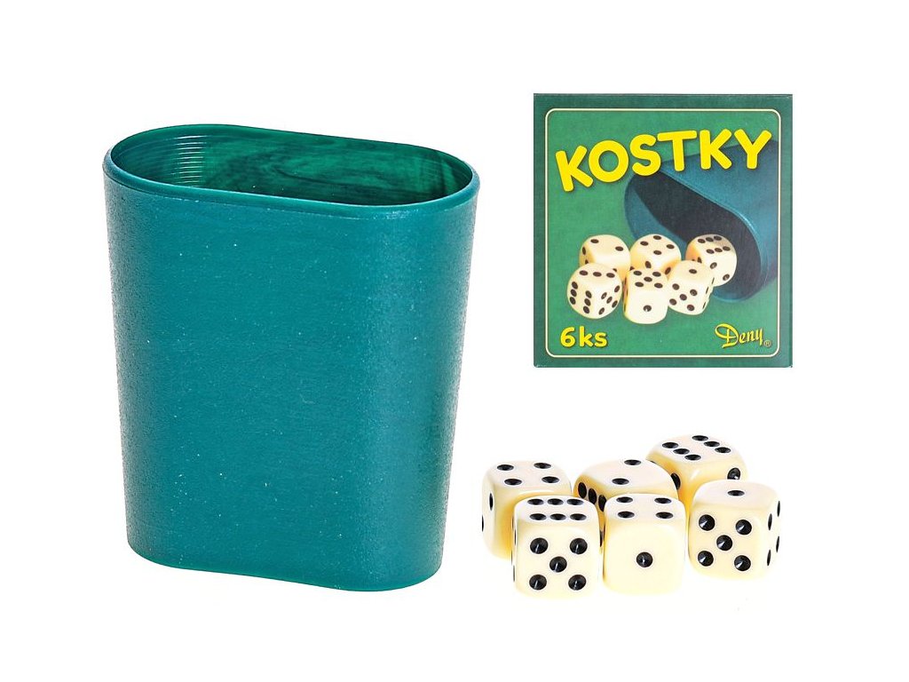 (BAL:1/100ks) Kostky hrací 16mm 6ks s pohárem.Hrací kostky na promíchání v poháru.Rozměr kostky 16x16x16mm.Balení obsahuje 6 kostek, pohár na promíchání. Nevhodné pro děti do 3 let.Balení: papírová krabička.Doplňkové parametry