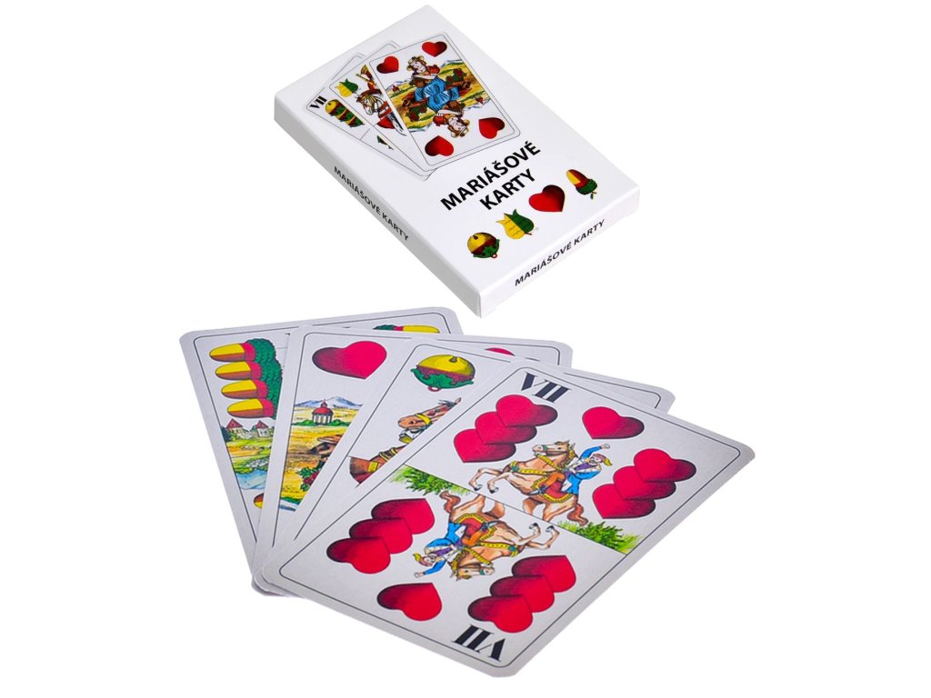 Hrací karty na mariáš, prší a další karetní hry. Dvouhlavé karty v papírové krabičce.Balení obsahuje 32 karet.Vhodné pro děti od 3 let.Rozměr balení: 6,5 x 10,5 x 1cm. Balení: papírová krabička.Doplňkové parametry