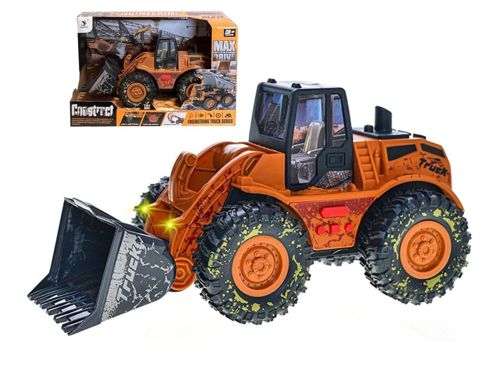 (BAL:1/24ks) Nakladač stavební Construct 25cm plast se světlem a zvukem na setrvačník. Pohyb: na setrvačník. Design: stavební stroj - nakladač. Svítí a vydává čtyři různé zvuky.Napájení: na baterie 3 x AG13/LR44 (součástí balení). Materiál: plast. Barva: oranžová. Rozměr: 25 x 13 x 11,5 cm. Vhodné pro děti od 3 let. Balení: papírová krabička s průhledem.Doplňkové parametry