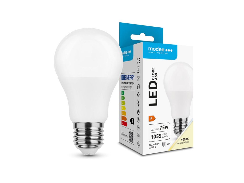 (BAL:1/10/100) .Patice: E27. Modelová řada: A60.Výkon: 11W (náhrada za 75W). Teplota chromatičnosti: studená 4000K. Světelný tok: 1055lm.Napětí: 220V-240V AC.Úhel vyzařování: 200°.Počet zap./vyp.: 12500x. Životnost: 25000hod. Energetická třída: F. Rozměry: 60x112mm. Balení: krabička se závěsem.Doplňkové parametry