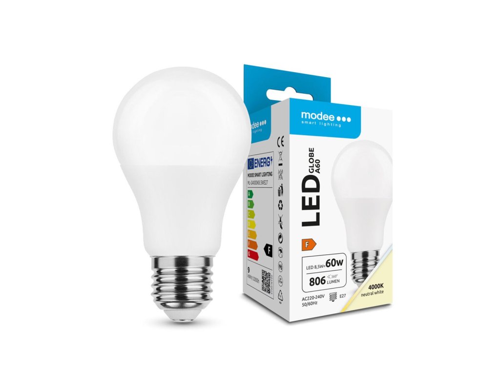 (BAL:1/10/100) .Patice: E27. Modelová řada: A60.Výkon: 8,5W (náhrada za 60W). Teplota chromatičnosti: studená 4000K. Světelný tok: 806lm.Napětí: 220V-240V AC.Úhel vyzařování: 200°. Počet zap./vyp.: 12500x.Životnost: 25000hod. Energetická třída: F.Rozměry: 60x108mm.Balení: krabička se závěsem.Doplňkové parametry