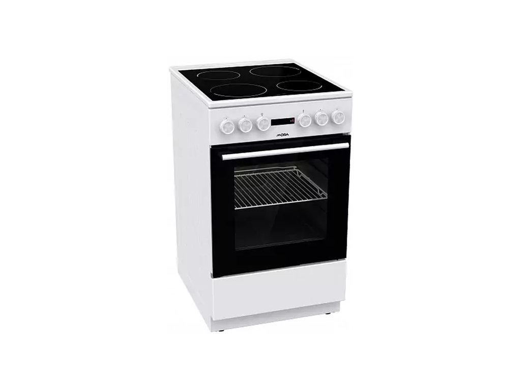 Elektrický sporák s klasickou troubou, bílá barva, sklokeramická deska, 4 HiLight varné zóny, vlevo vpředu O 18 cm, 1,7 kW, vpravo vpředu O 14,5 cm, 1,2 kW, vlevo vzadu O 14,5 cm, 1,2 kW, vpravo vzadu O 18 cm, 1,7 kW, ukazatel zbytkového tepla varných zón, klasická trouba – 3 způsoby ohřevu, ECO CLEDoplňkové parametry