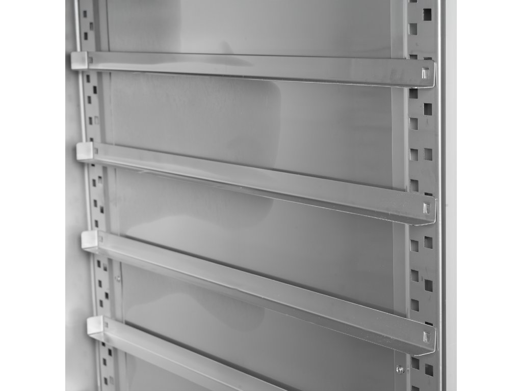 Řada mrazicích skříní BF je navržena s rozměry Euronorm a má 9 vodicích lišt pro pekařské plechy o rozměrech 600 × 400 nebo 600 x 800 mm, což usnadňuje organizaci a přístup. Tento konkrétní model je navíc vybaven policemi, které pojmou až 54 GN na zmrzlinu 360x165x120 mm o objemu 5 l, čímž se rozšiřuje jeho všestrannost.Doplňkové parametry
