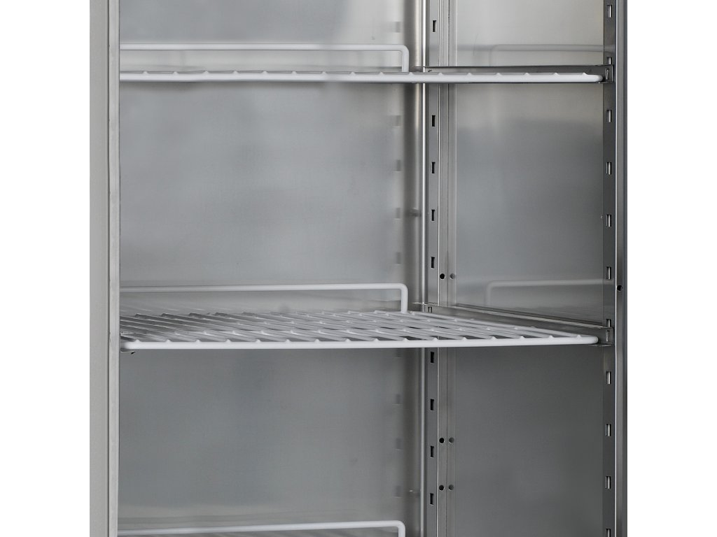 Řada RF mrazicích skříní s 1 nebo 2 plnými dveřmi je určena pro profesionální kuchyně a disponuje nastavitelnými policemi. Mrazicí skříň je vyrobena z vysoce kvalitní nerezové oceli SS304 vhodné pro gastronomii a má odolná kolečka pro snadné přemísťování, což se hodí také při úklidu. Ventilované chlazení zajišťuje čerstvost obsahu a teplotu lze nastavit na digitálním termostatu. K dispozici je také řada RK s rozměry GN.Doplňkové parametry
